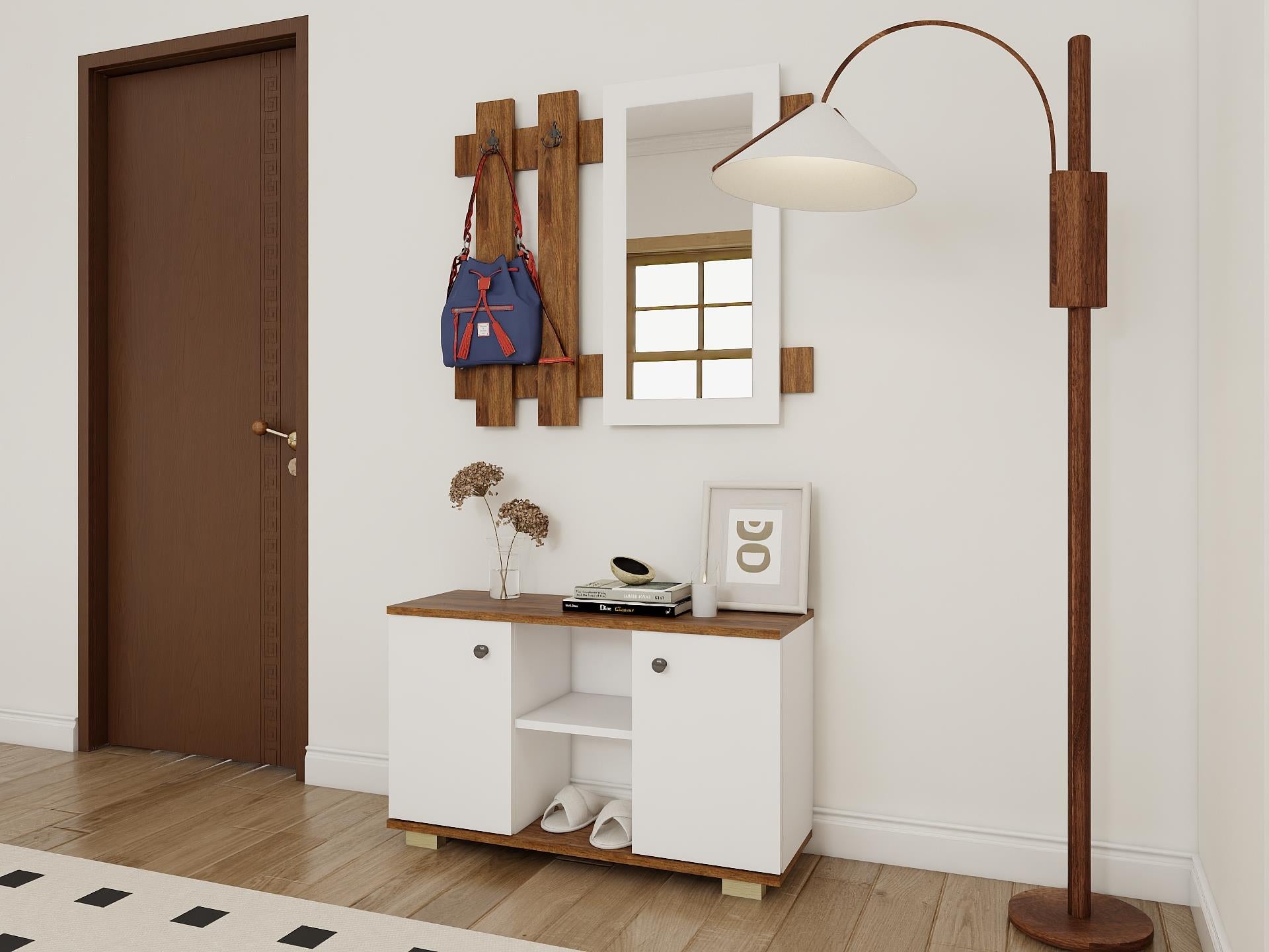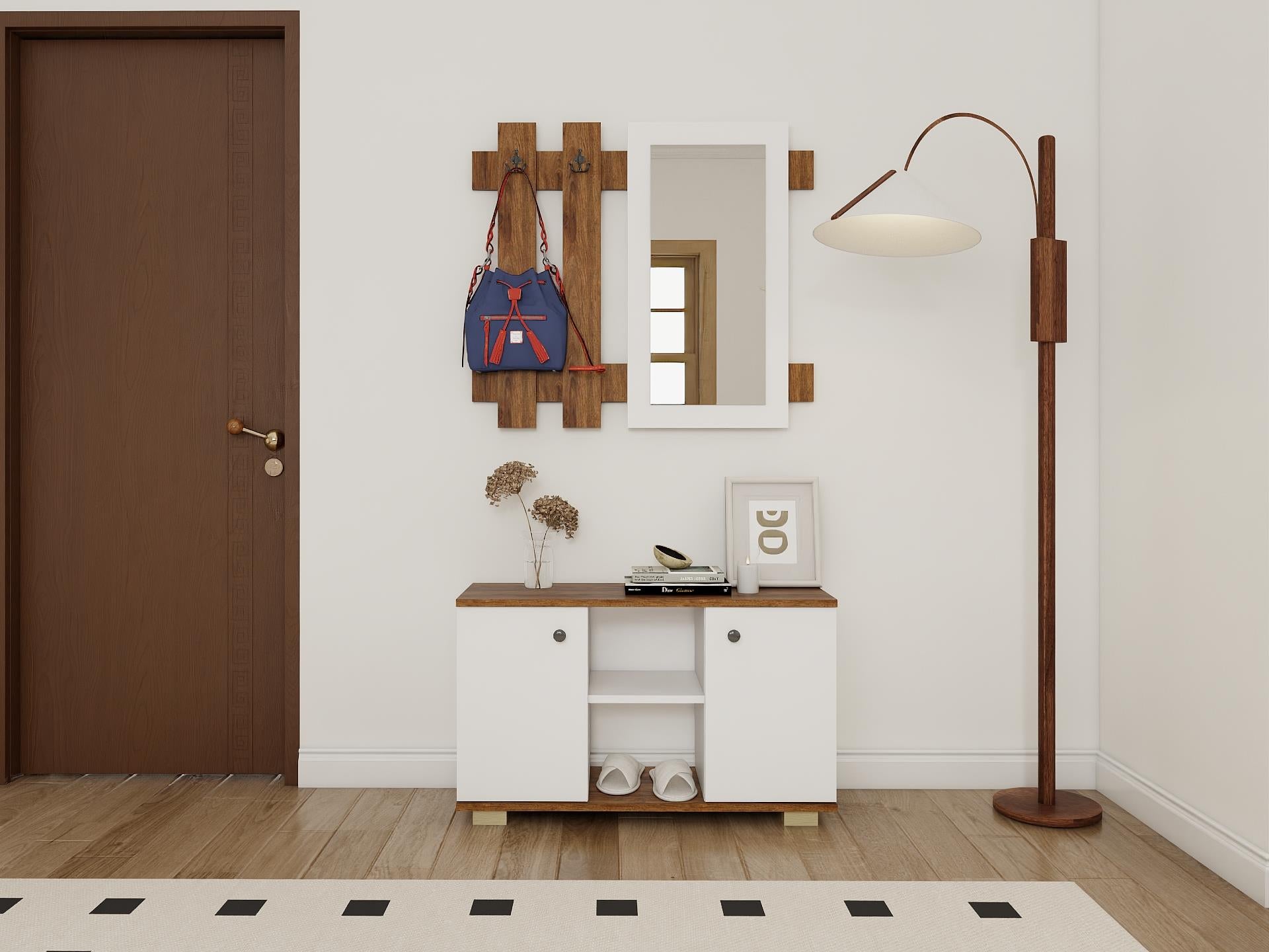 Boy aynası ve duvarda asılı olan şemsiye ve çanta dekor amaçlı kullanılmıştır.